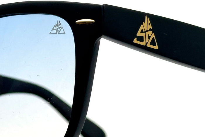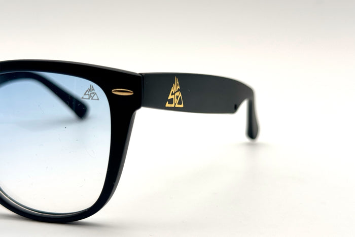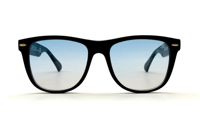 Montatura nera con dettagli e fregi a effetto oro lucido, abbinata a lente azzurra dal carattere deciso e riconoscibile.